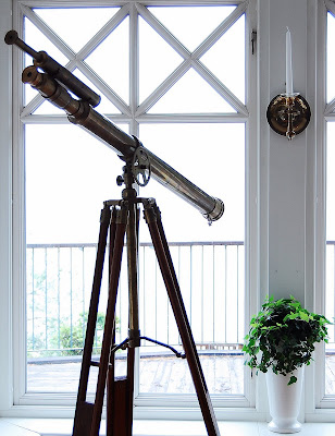 avDetta är en bild från vårt vardagsrum. Kikaren tycker jag är fin och den pryder sin plats i det stora fönsterpartiet. Det som är synd är att den är rätt tongivande för den övriga inredningen. Jag skulle gärna ha det lite ”modernare”, men då blir det svårt med kikaren…