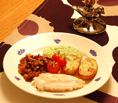 Mälargös med broccolicréme,stekta kantareller och ugnsbakade potatishalvor!