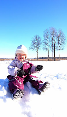 Innan Lillan lämnades i mormor och morfars vård var vi ute och prommenerade i solen, som värmde skönt! Trots att solen värmde och fåglarna kvittrade kändes det inte som vår, snarare en vacker vinterdag! Kylan bet i kinderna på de ställen där vinden fick fart och inte tillstymmelse till takdropp någonstans… Undrar just när den efterlängtade våren kommer?