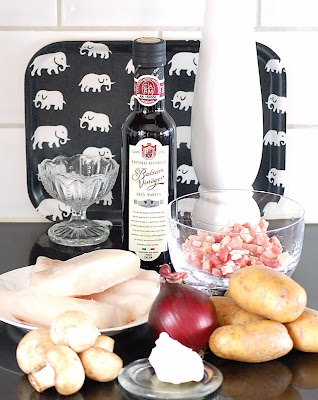 Lägg fisken åt sidan när den lätt faller isär. Fräs champignonerna tillsammans med baconen. När bacon och champignoner är färdiga och fått fin färg, tillsätt lök och balsamvinäger. Låt fräsa på låg värme någon minut. Salta och peppra (svartpeppar).