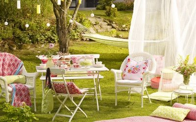 En vit möbelgrupp med lite pastelliga kuddar under päronträdet, tror jag blir fint! Där passar det också att anlägga en sandlåda av liknande sort som denna!