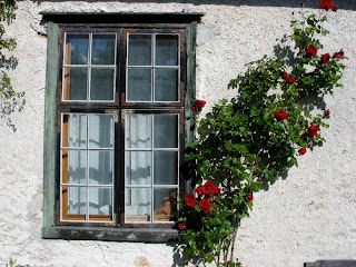 Självklart växer mängder av underbara mörkröda klätterrosor runt fasaden!