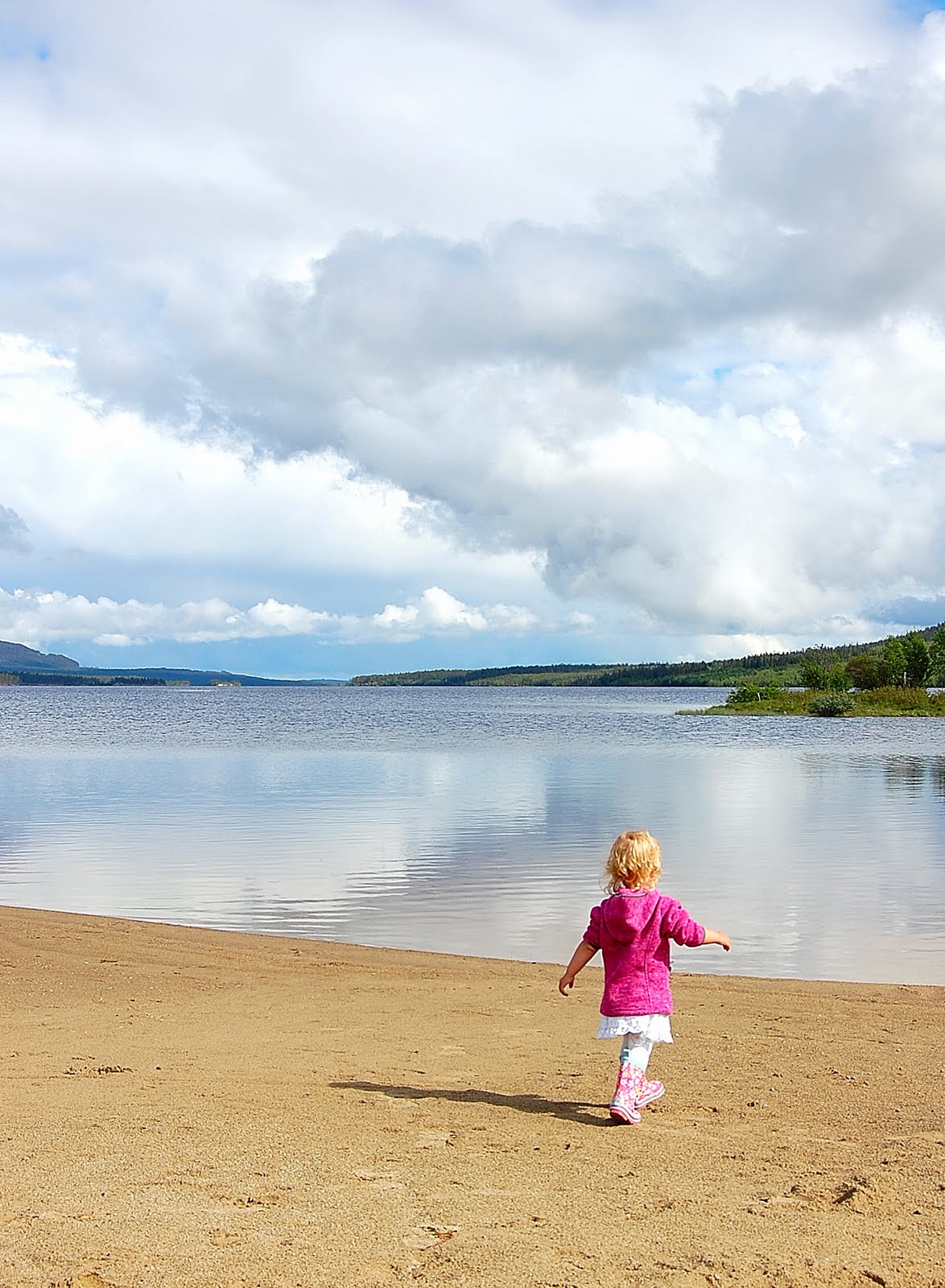 När vi kom ut efter fikat hade regnet upphört och solen smög sig fram mellan molnen! Vi åkte en sväng upp på fjället och ”tittade till” vår tomt, och efter det tog vi en sväng förbi stranden för att kolla badtemperaturen. Typ 7 grader! Inget badande alltså!