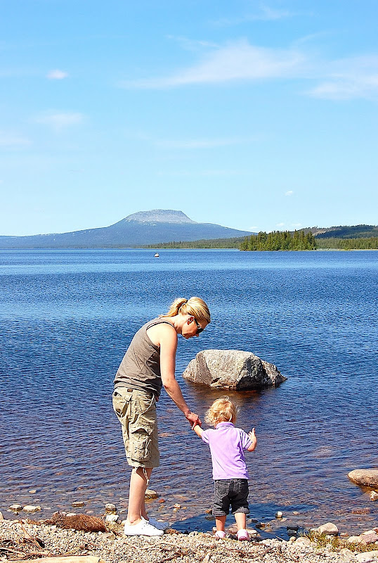 Igår cyklade vi Lofssjön runt, en vända på hela 4 mil! I strålande solsken och med matsäcken packad stack vi iväg med Lillan bakpå! 4 timar tog det oss att trampa runt. Tre timmar effektiv tid och en timmes paus! Vi hittade den här vackra stranden/rastplatsen där vi stannade. Lillan älskar att bada så kläderna åkte av och en liten lycklig tjej plaskade runt en stund i den kalla fjällsjön.
