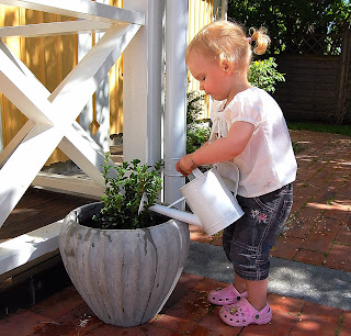 Söta Lillan deltar ivrigt i allt från ogräsrensning, gräva i rabatter (!) och till att som här, under stor koncentration, vattna nyplanterade Buxbom med sin nya fina lilla vattenkanna!