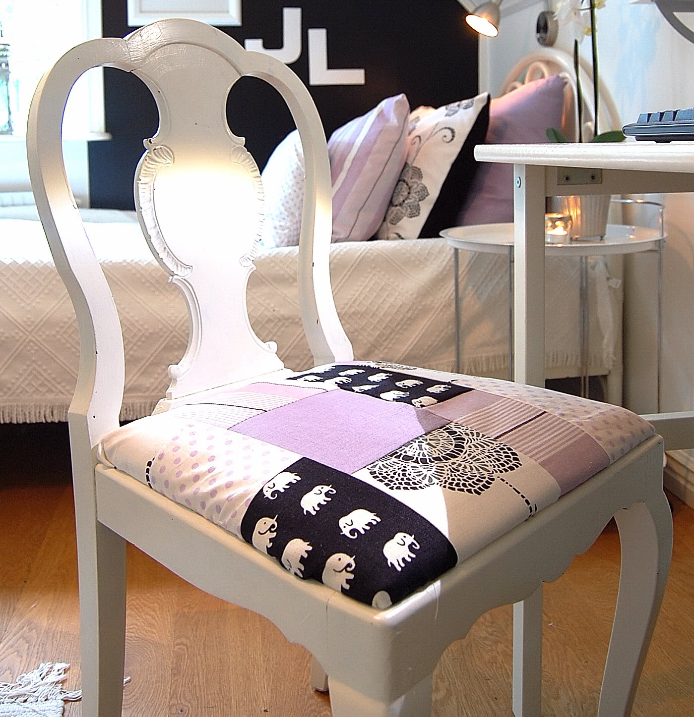 Nu börjar J:s rum att bli färdigt. Ännu återstår lite grejor som måste fixas, men jag kan visa mitt verk från igår. Nysydda kuddar och stolsits på den gamla stolen jag målat och ärvt från min farmor och farfar.