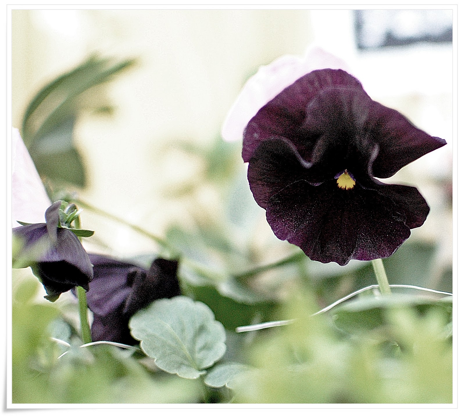 Julrosen sällskapar med ljusrosa och svarta Penséer.