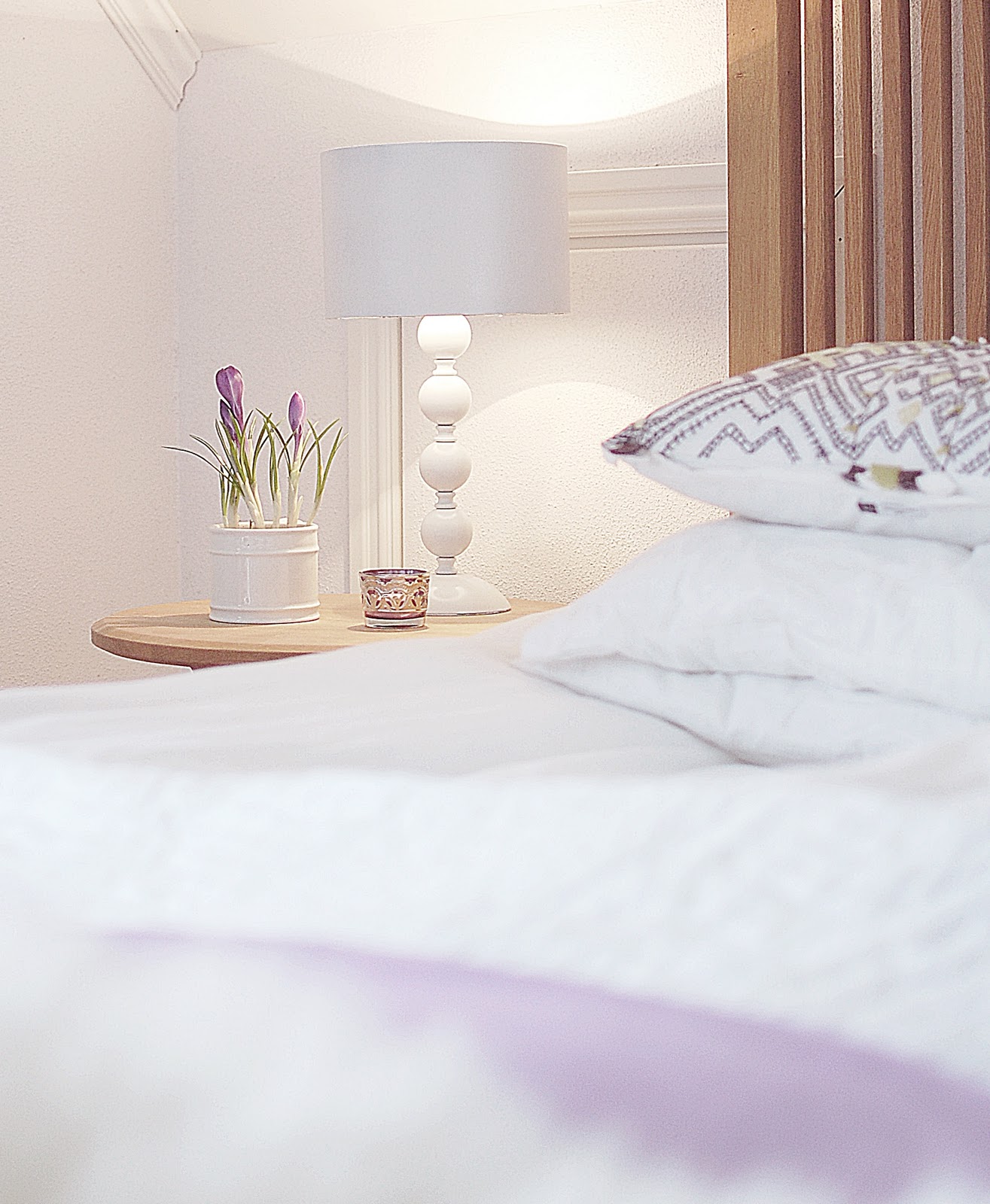Jag har tagit bort allt det svarta hårda och fört in mjuka feminina färger som olika nyanser av lila, lite grått och silver. Det vita överkastet har jag vikt ned så det täcker halva sängen, uppe på det