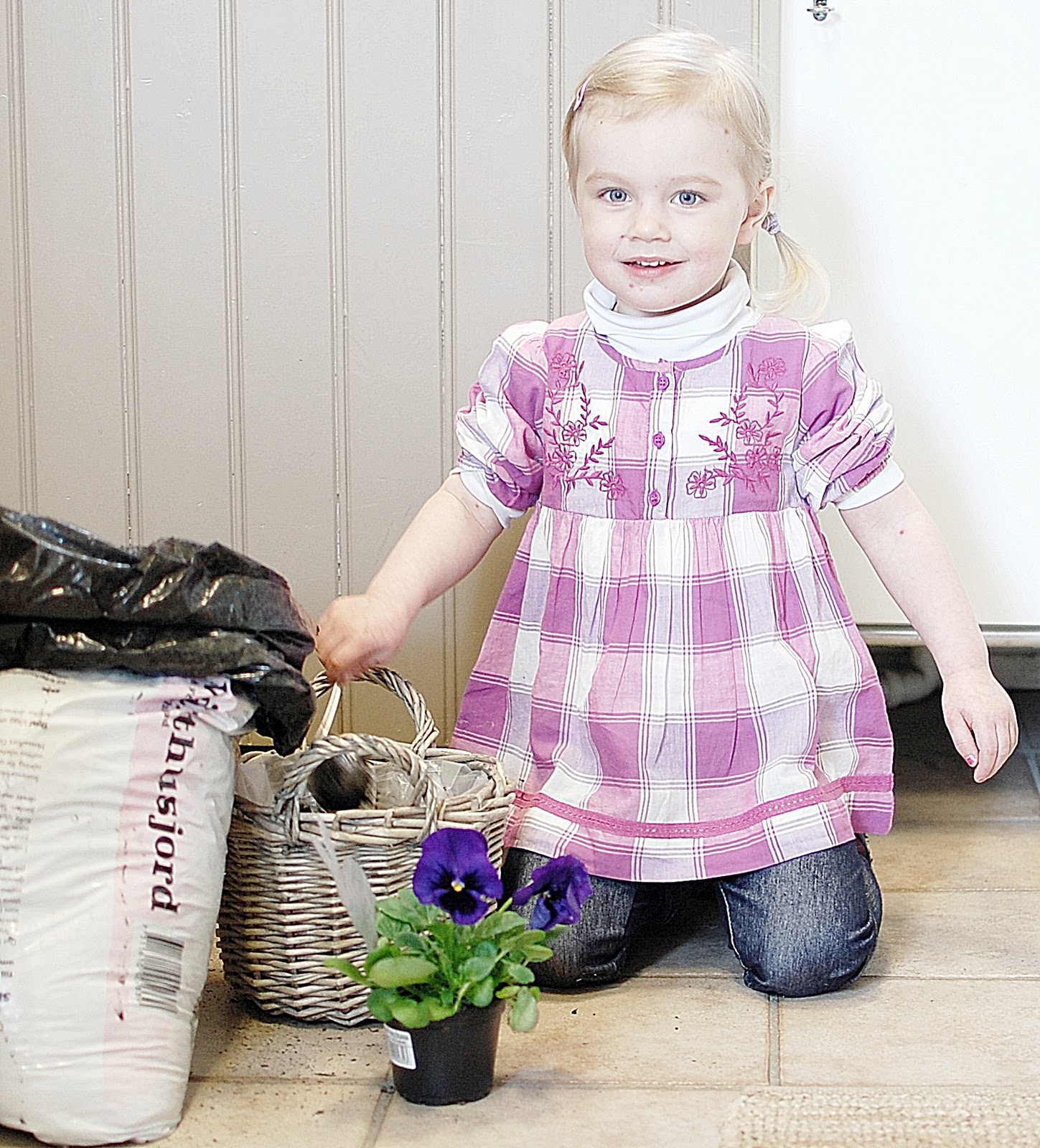 Helt fel klädsel för blomplantering, men Lillan tyckte det var jättekul och tog sitt uppdrag på fullaste allvar. Vi var överens om blomman, zinkkaninen, riset och sisalen men det skar sig när vi kom till de lila äggen…