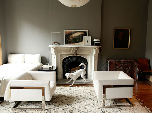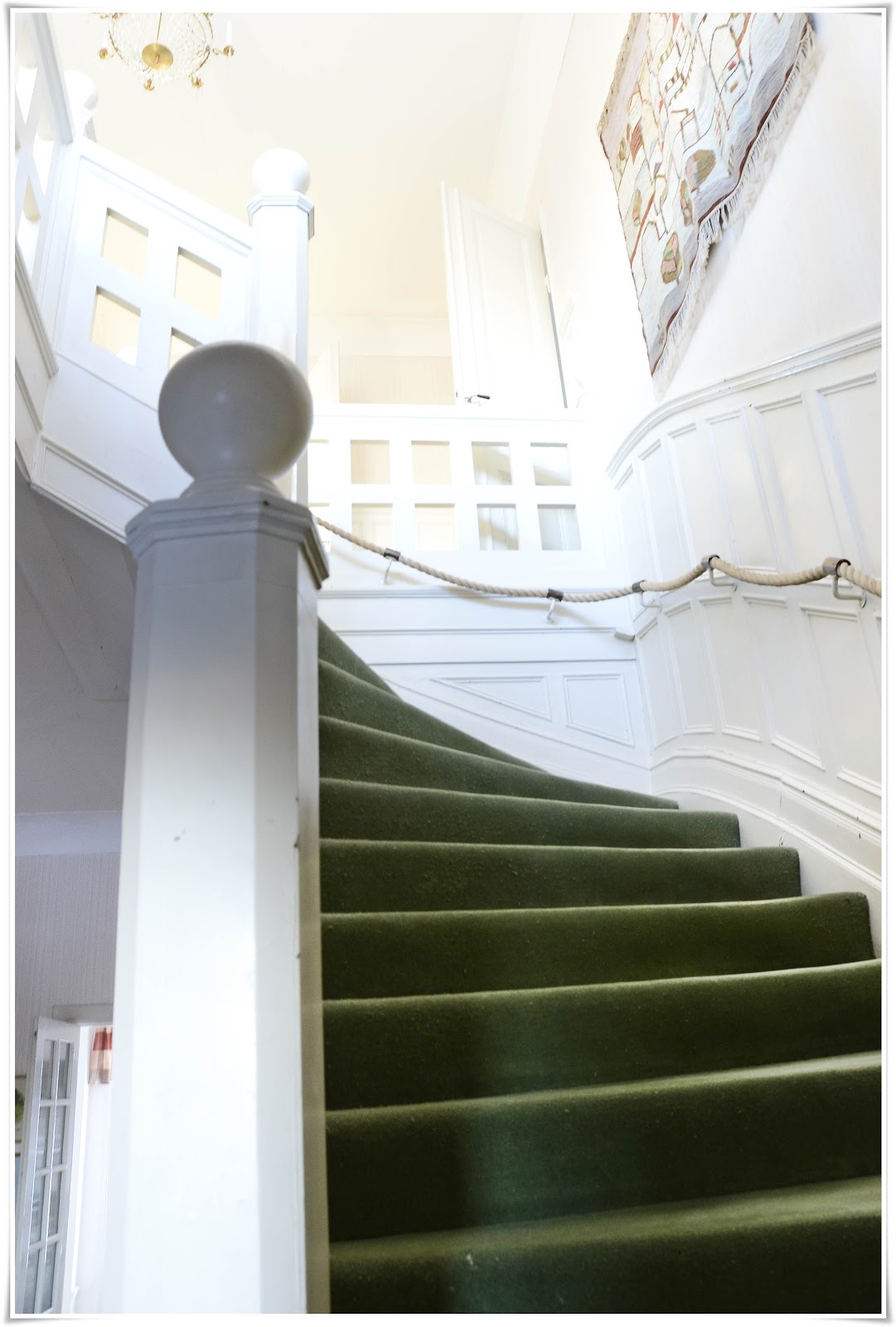 Den där grå färgen på väggen är inte helt tokig, lite för mörk kanske. Skulle fungera fint med en lite ljusare hos oss tror jag. Eftersom vi har sådana där jättebreda lister och olika varianter av vitmålad bröstpanel med speglar så blir det inte mörkt och tungt utan en snygg kontrast till de vitmålade snickerierna. Vi får se.