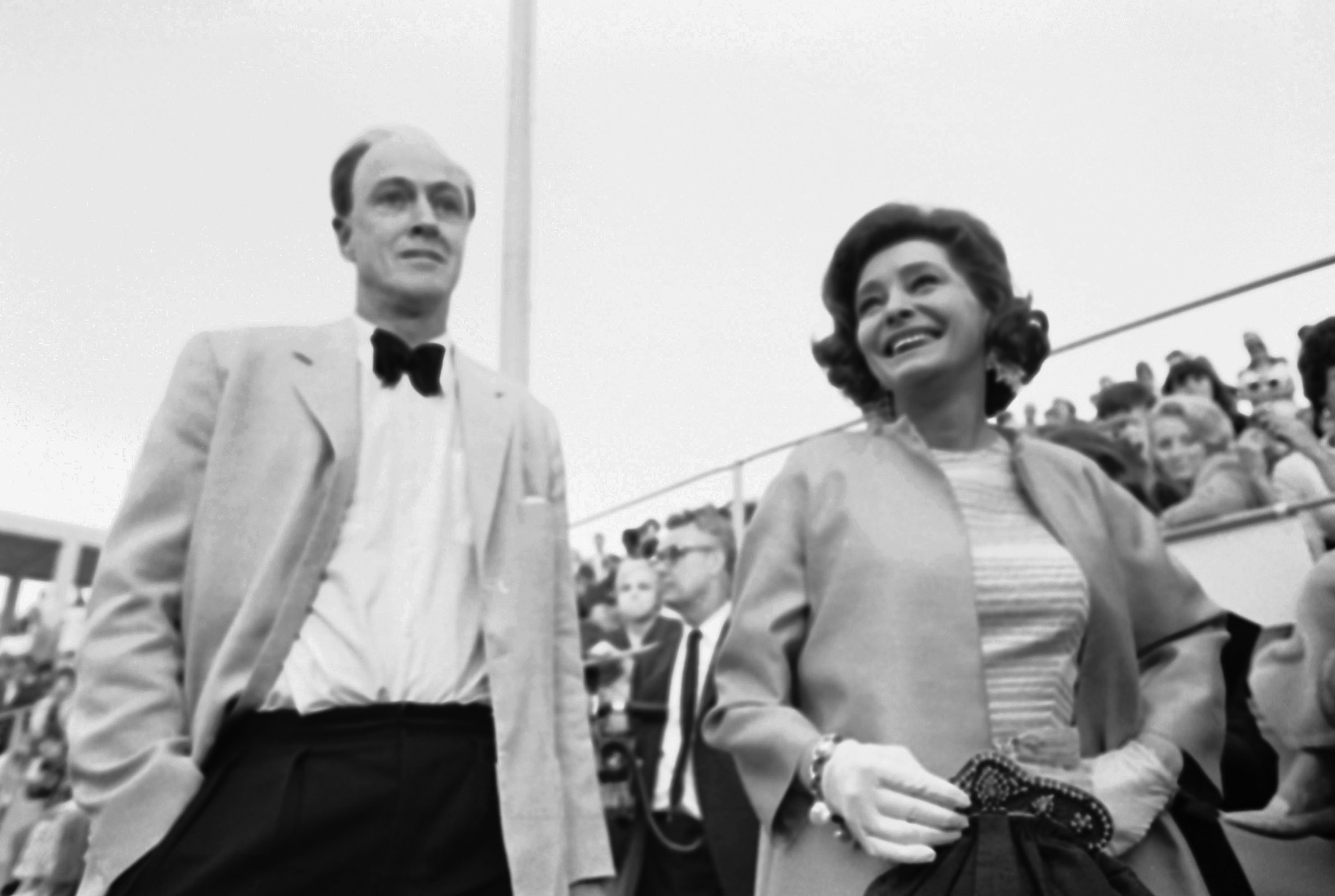 ap foto : ap : file this april 11, 1969 file photo shows actress patricia neal and her husband roald dahl arriving at the academy awards. the family of roald dahl is trying to raise the funds to preserve a hut in which the late writer wrote tales of big friendly giants and magical chocolate factories. the family hopes to raise 500,000 pounds ($790,000) to stop the 50-year-old brick and polystyrene shed _ preserved as it was when dahl died in 1990 _ from falling apart. (ap photo) / scanpix code: 436 april 11, 1969 file phot britain-roald dah automatarkiverad